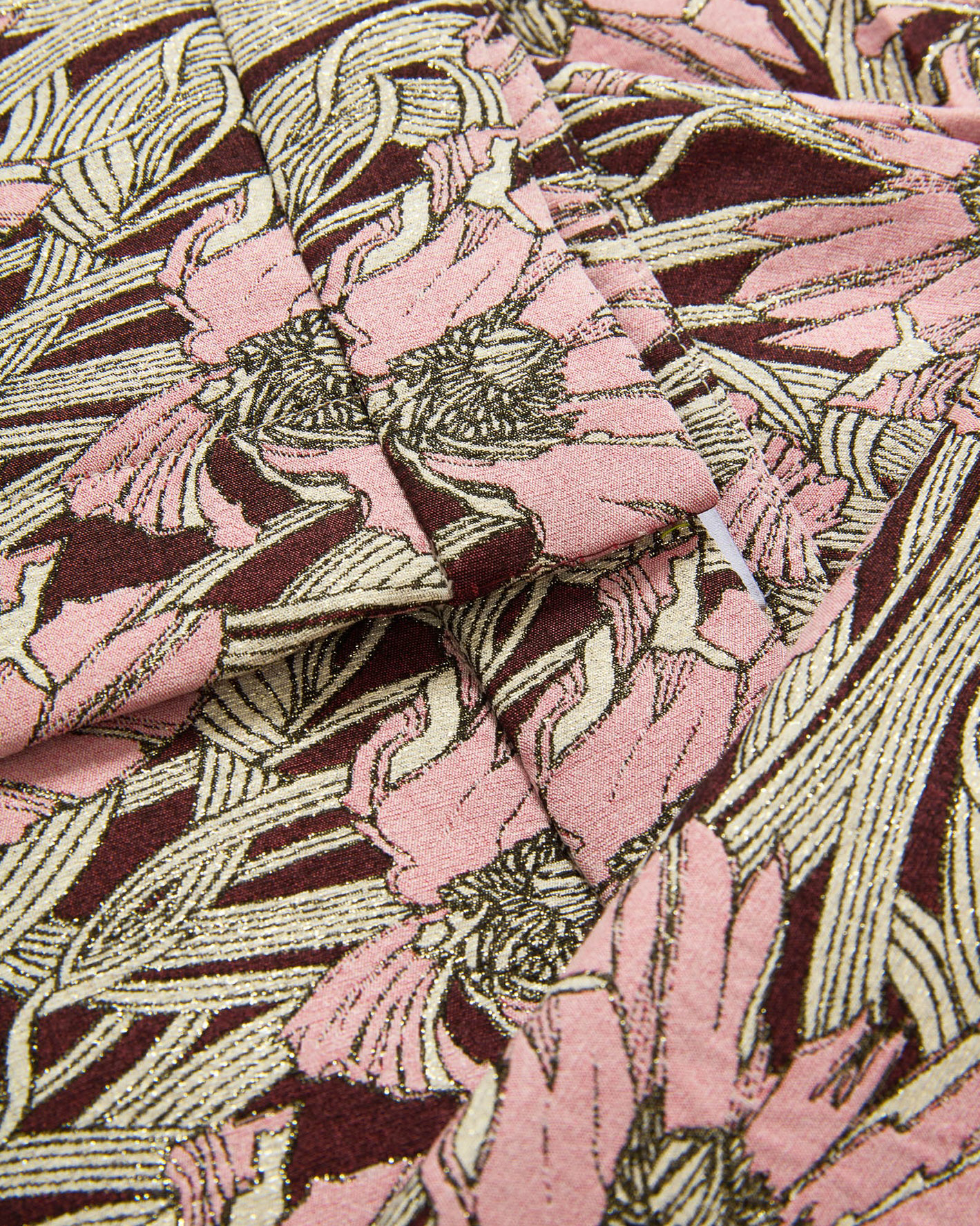 A VB favorite, reimagined in burgundy and pink florals. The Arte pants are cropped and high-waisted with a slim fit and slight flare. Flat welt pockets and a hidden hook-and-bar closure create a sleek, tailored look, while metallic gold threads add a subtle sheen for an elevated finish. Perfect for everyday polish, style it with the coordinating Jessup vest for a matching set or with a cashmere tank top for something more relaxed.