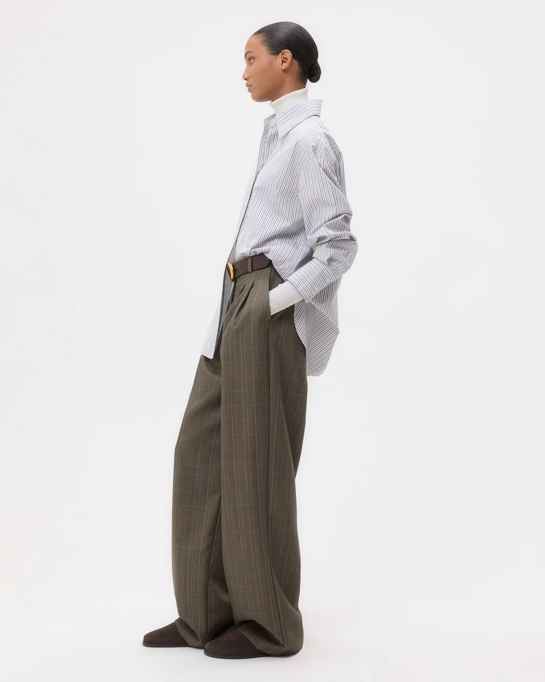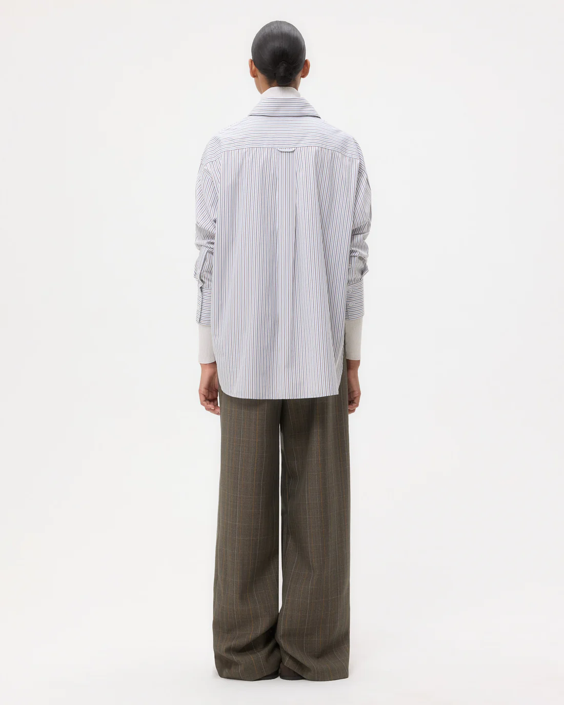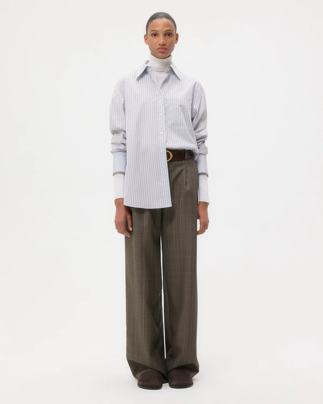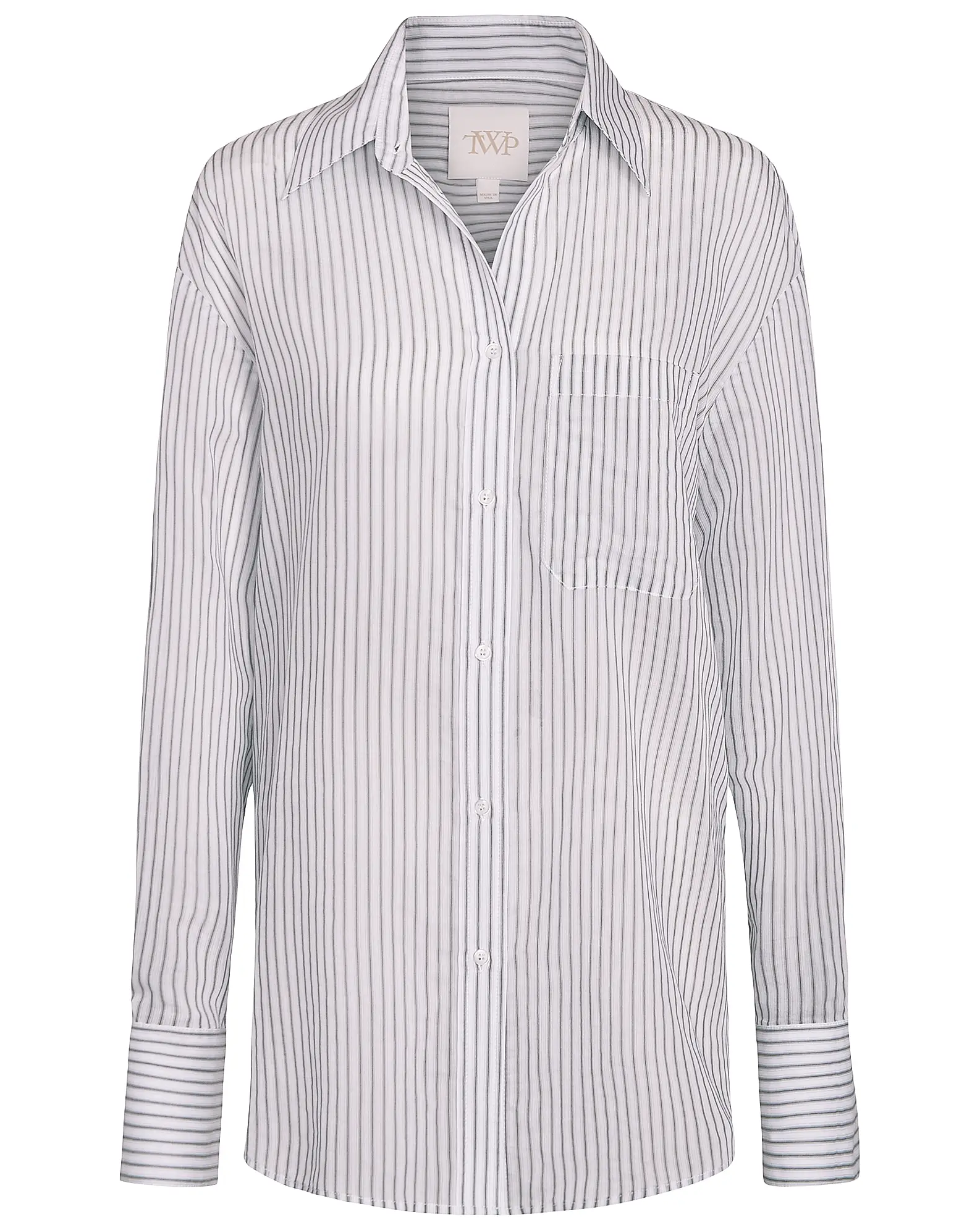 Oversized shirt in Italian cotton stripes. This fabric has bold stripes woven into our signature lightweight poplin shirting. The Big Joe is a menswear inspired, relaxed button down. Complete with a chest patch pocket, button up placket, french cuffs and a tulip hem.