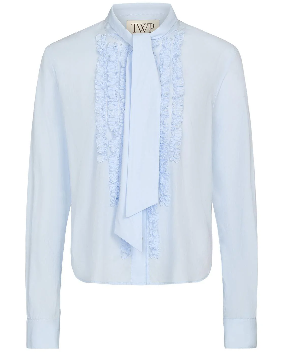 Fitted shirt with an attached neck tie in micro check. Fabric is a micro check poplin, produced and finished in Italy by a 150-year heritage shirting mill. The Connor Top features delicate ruffle detailing along the placket and collar. Designed with a tailored fit through the body and finished with long sleeves, button cuffs, and a curved hem.