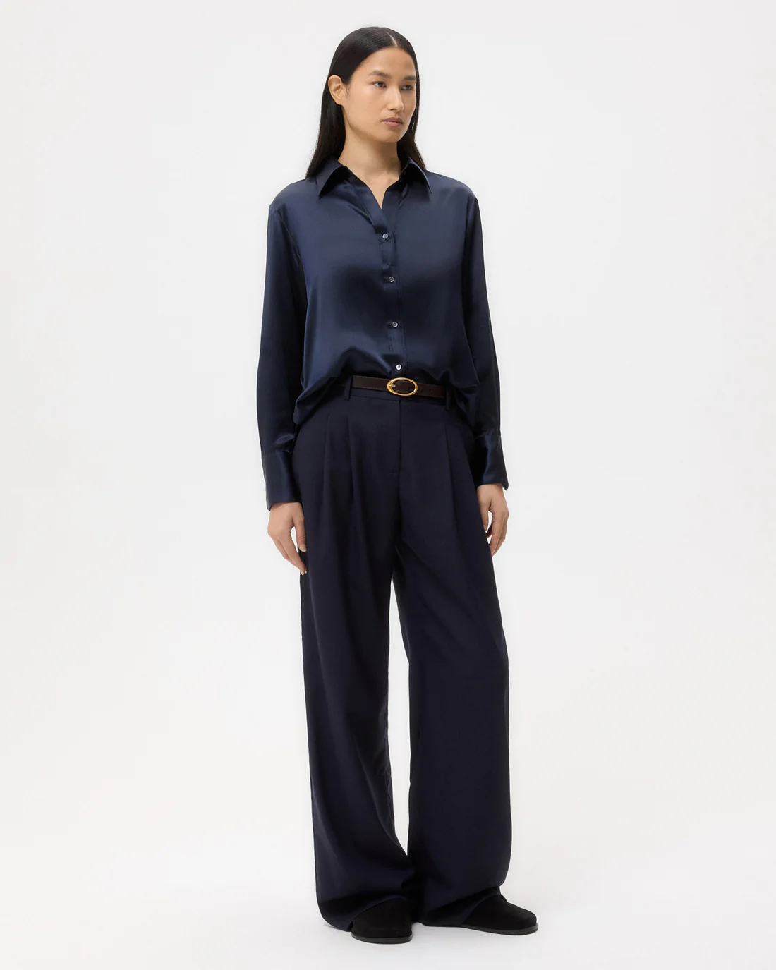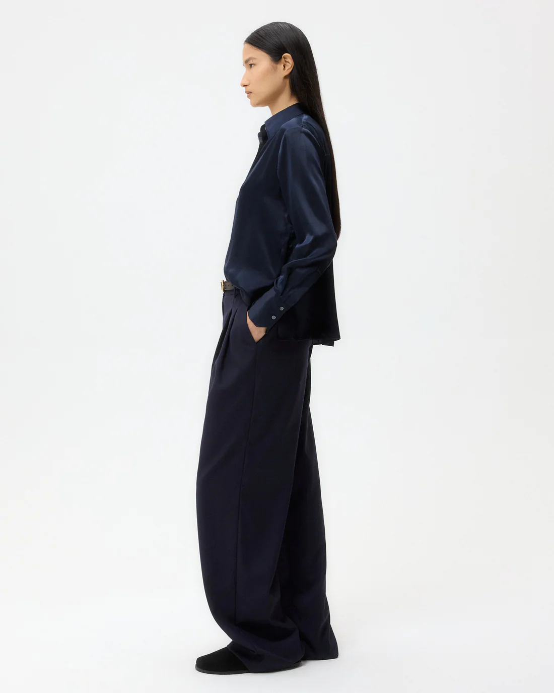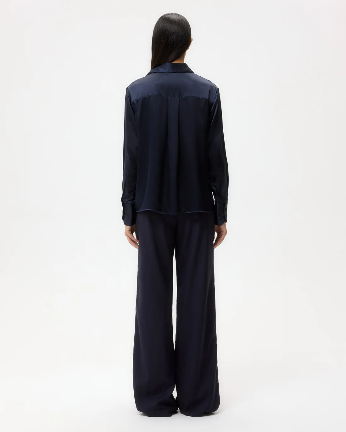 Button down shirt draped in semi-sheer silk georgette. The Joey is a classic fit with an inverted box pleat at the back and raw shirttail hem. Complete with an exposed placket, chest patch pocket, spread collar, and round cuffs.