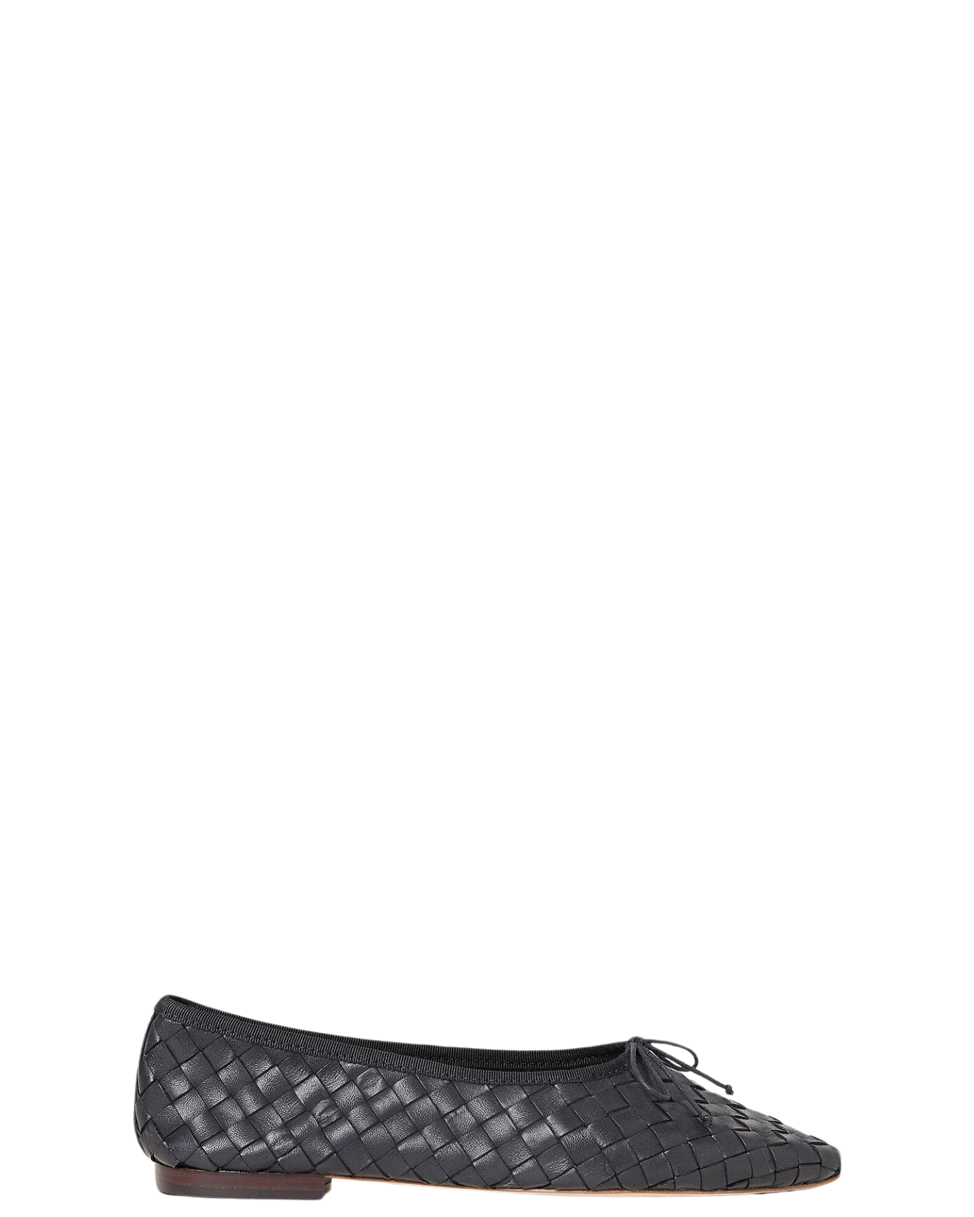 Ballet flat in black woven leather. Features a slightly elongated, almond-shaped toe and a padded footbed. Slips on.