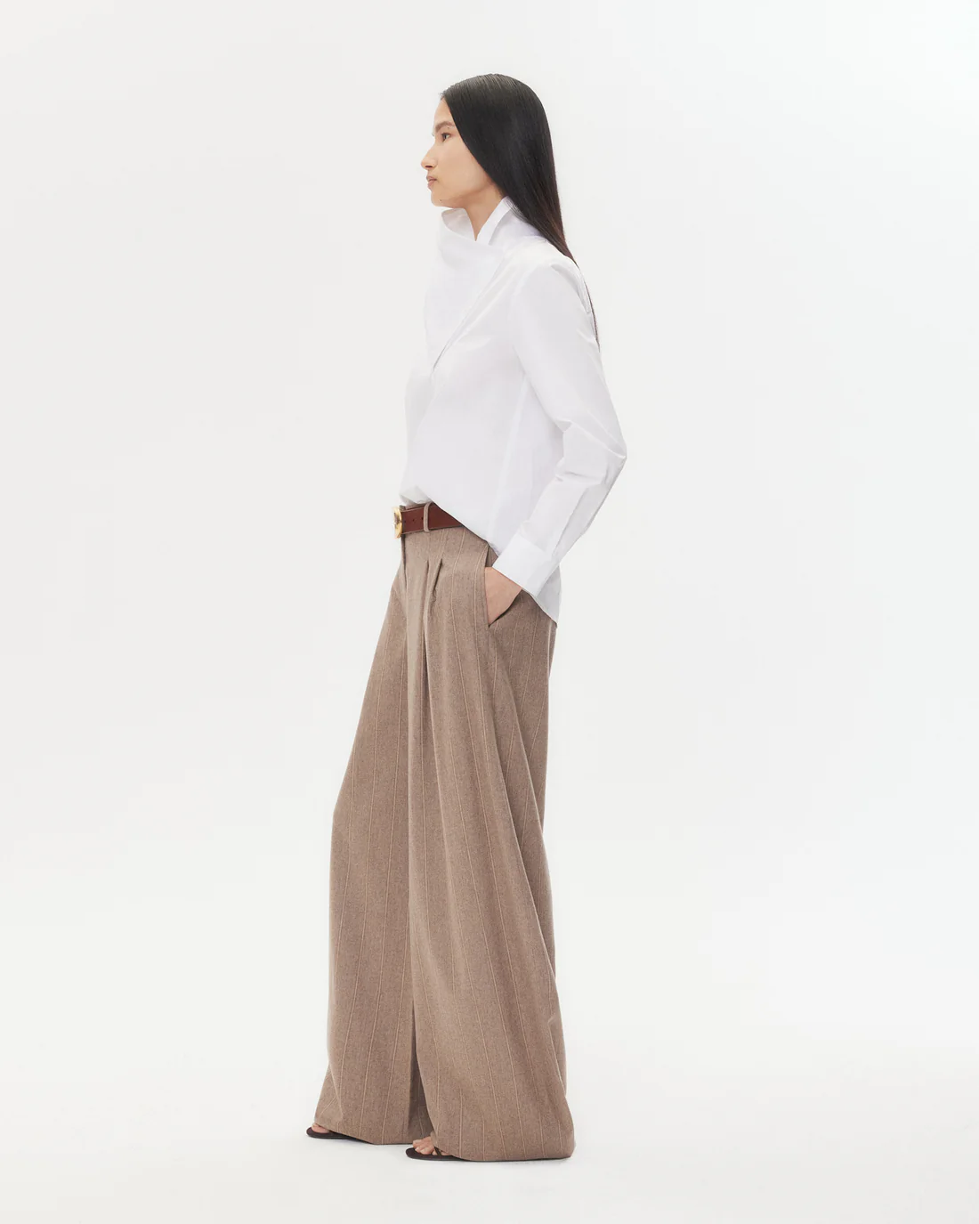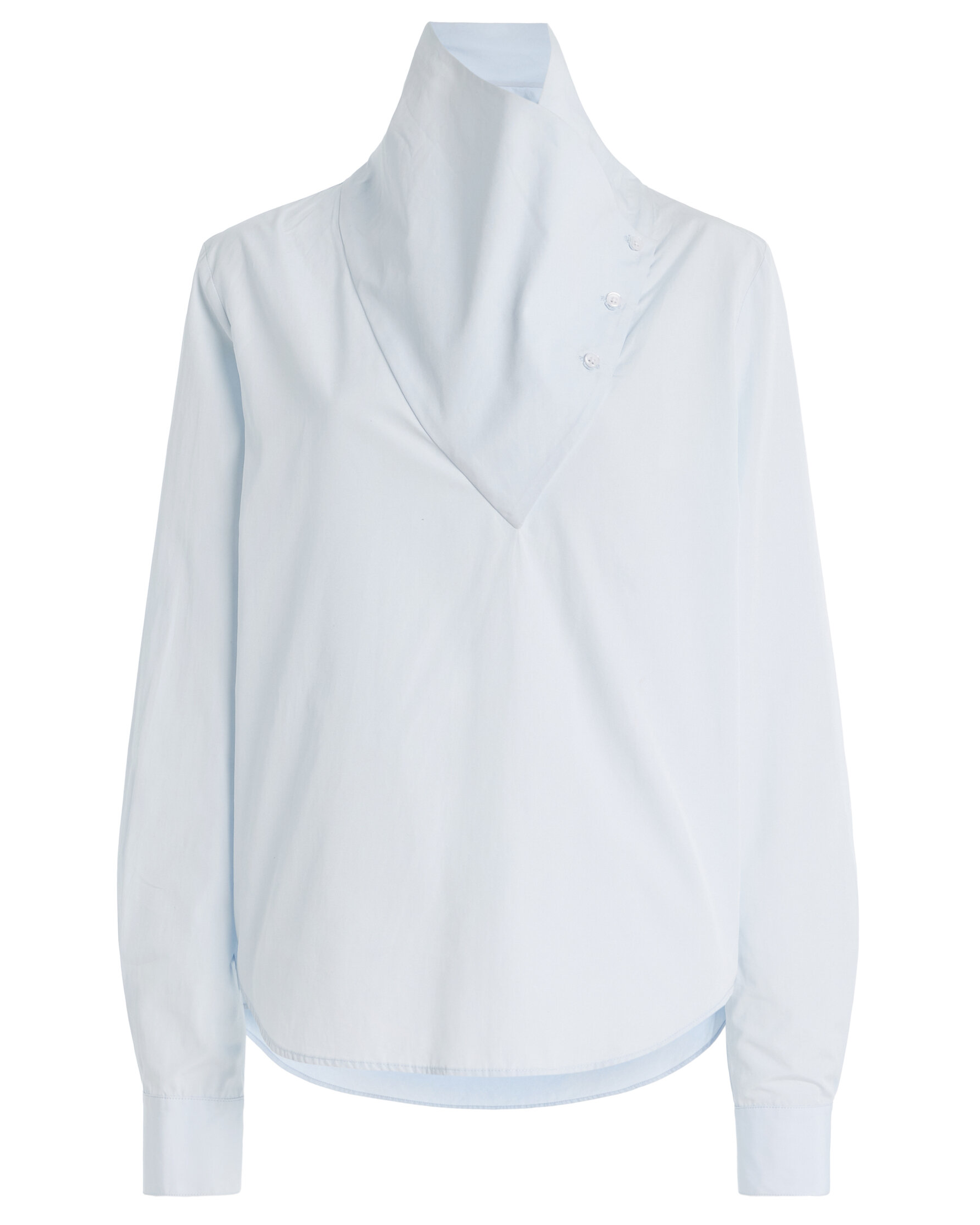 Long-sleeve, funnel neck blouse in super compact poplin. This dense cotton shirting is structured with a soft hand feel. My Maria is a relaxed fit, with an asymmetrical fold over collar that can be buttoned up or down. Complete with a center box pleat at the back, barrel cuffs and curved hem.