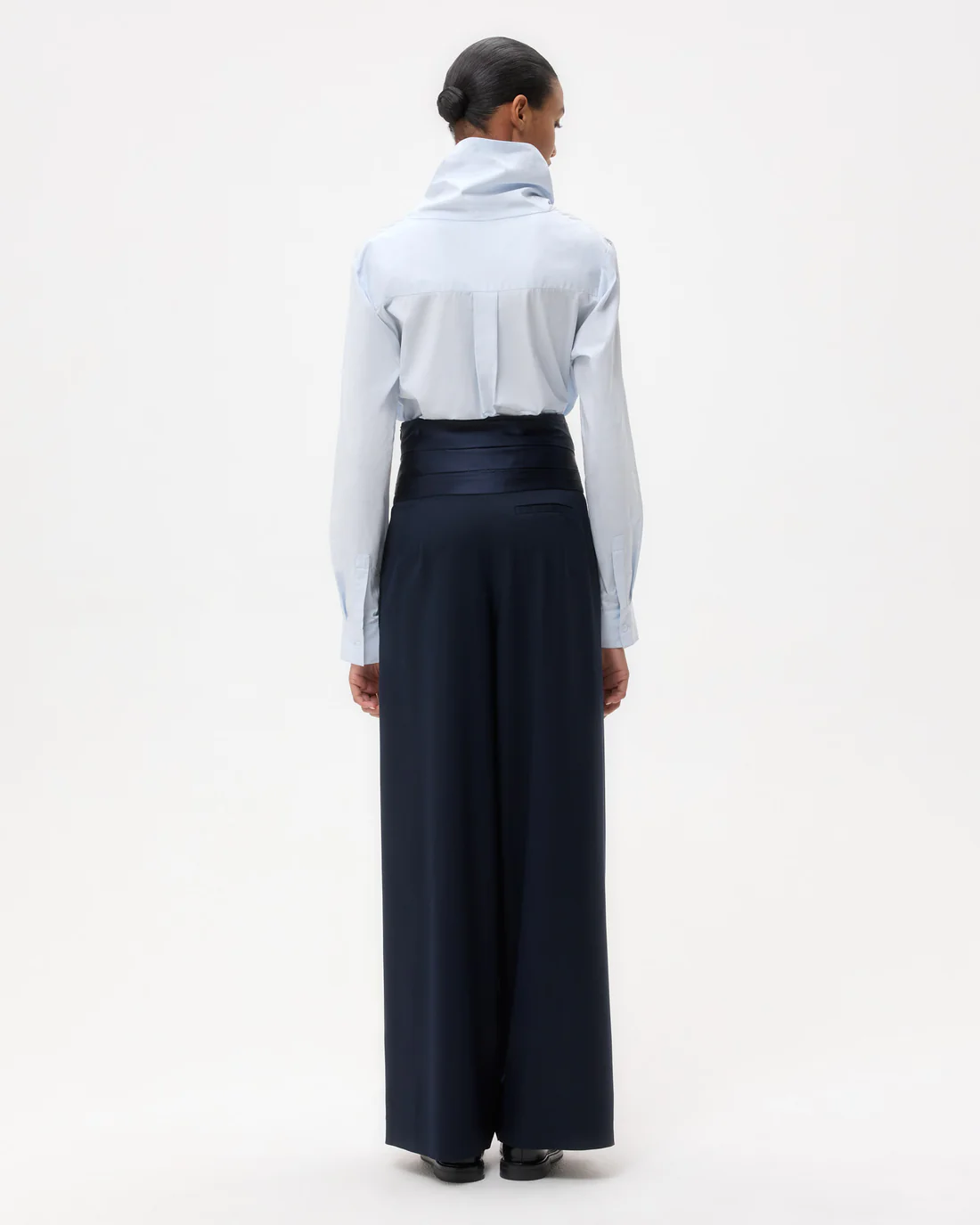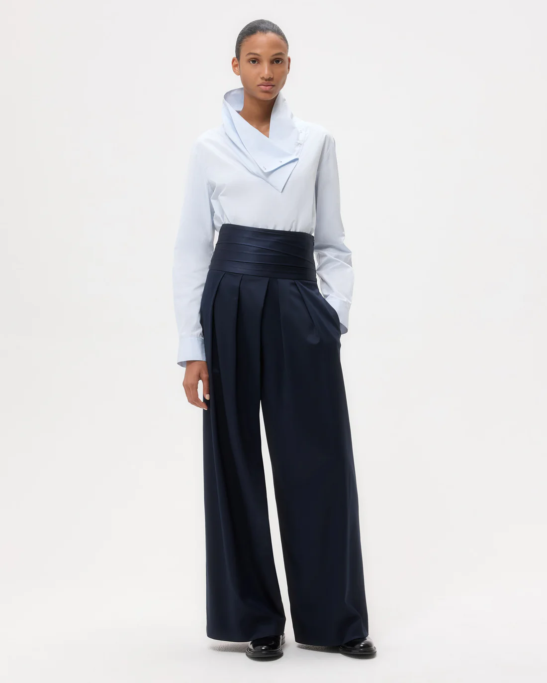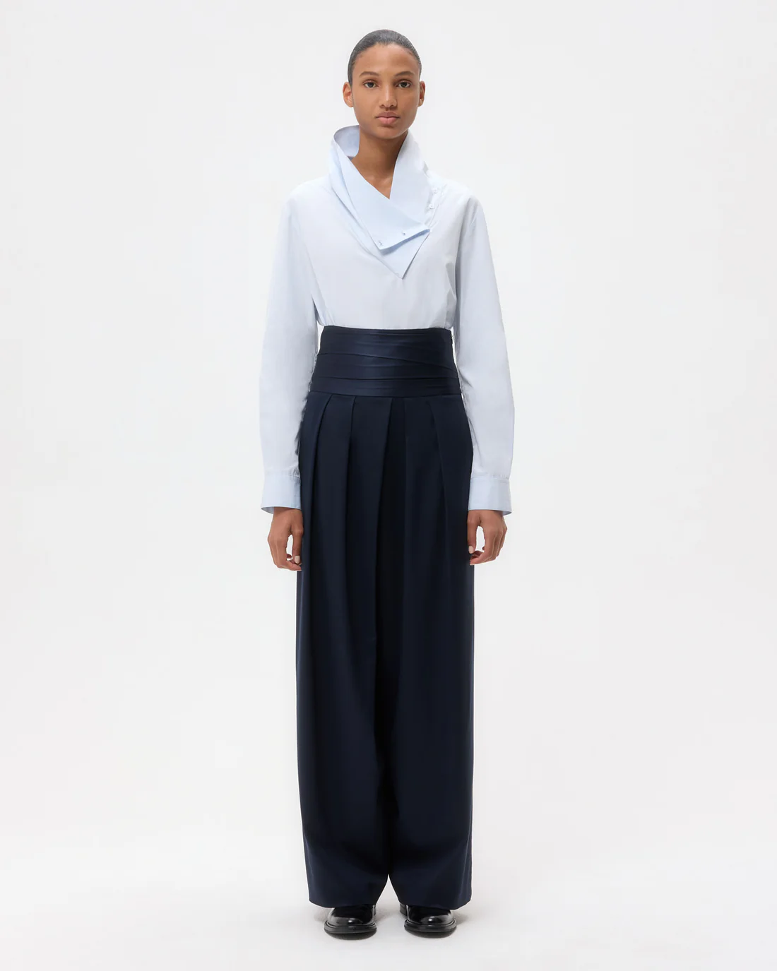 Long-sleeve, funnel neck blouse in super compact poplin. This dense cotton shirting is structured with a soft hand feel. My Maria is a relaxed fit, with an asymmetrical fold over collar that can be buttoned up or down. Complete with a center box pleat at the back, barrel cuffs and curved hem.
