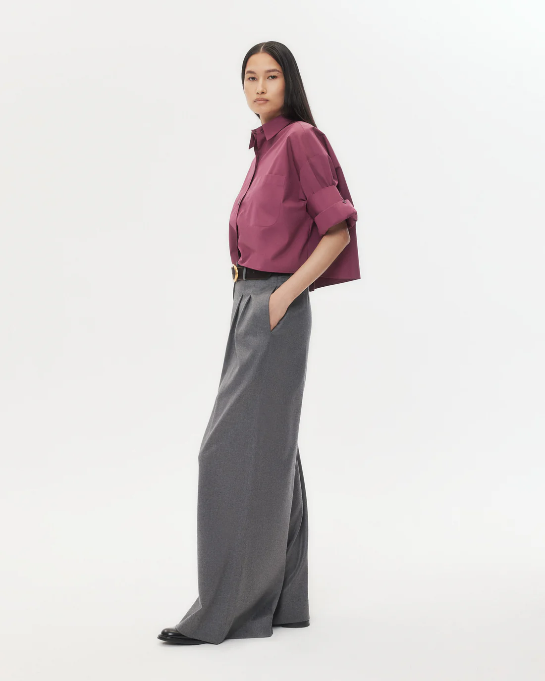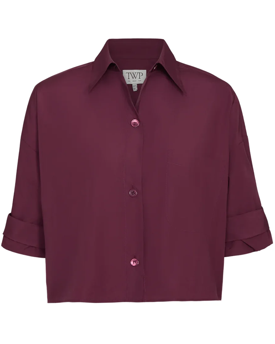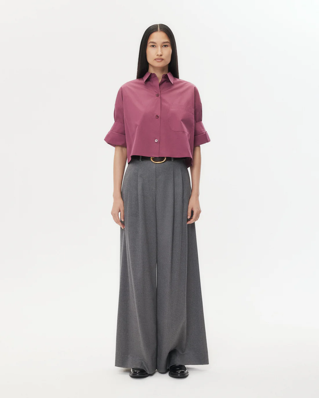 Cropped, short sleeved button down in striped cotton poplin. Boxy silhouette. Complete with a chest patch pocket, button up placket, spread collar, and our signature double roll button cuffs.