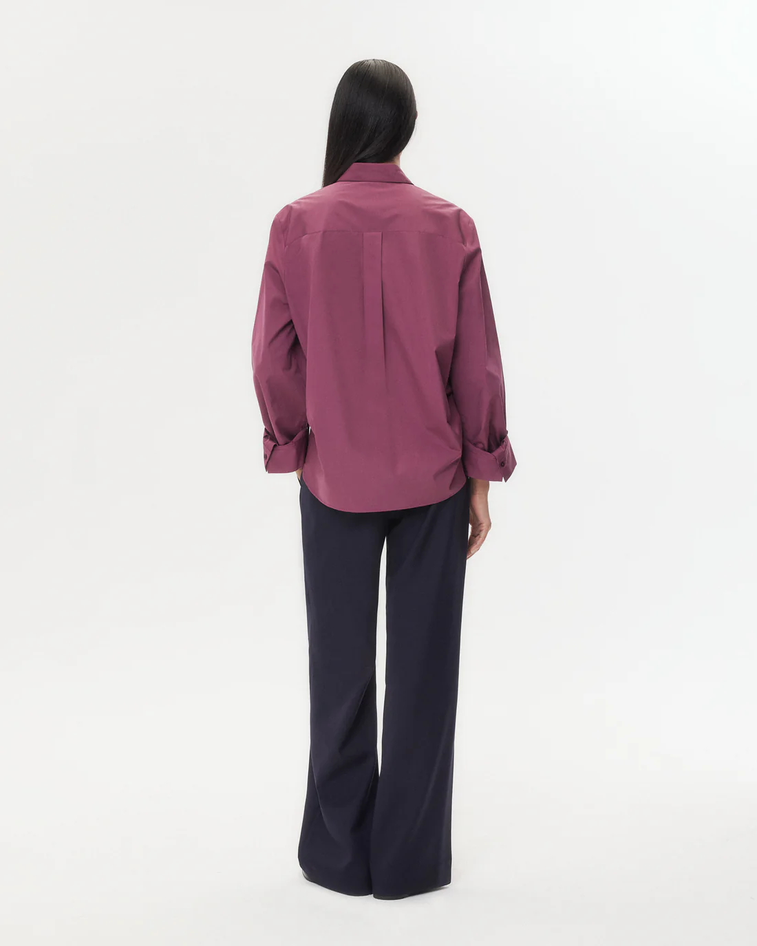 Oversized button down shirt in super compact cotton poplin. This fabric is structured with a smooth texture and crisp hand feel. The Next Morning is a relaxed silhouette with a center box pleat at the back. Complete with an exposed button up placket, chest patch pocket, spread collar and single roll button cuffs.