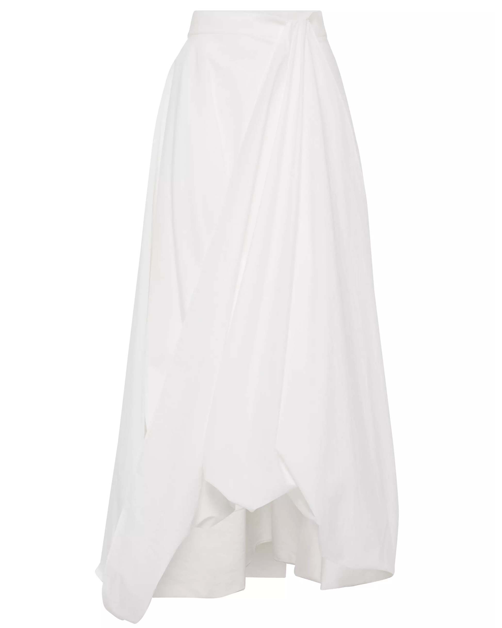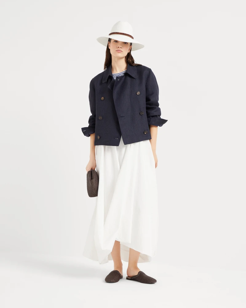 Voluminous and feminine, this Bubble Hem skirt interprets the balloon silhouette in a Brunello Cucinelli way. The design is characterized by its relaxed, ethereal appearance, created by the fabric’s soft fold in the front that runs upwards for a very natural drape. The lightweight techno cotton poplin complements the skirt’s fluid lines with a summery feel.